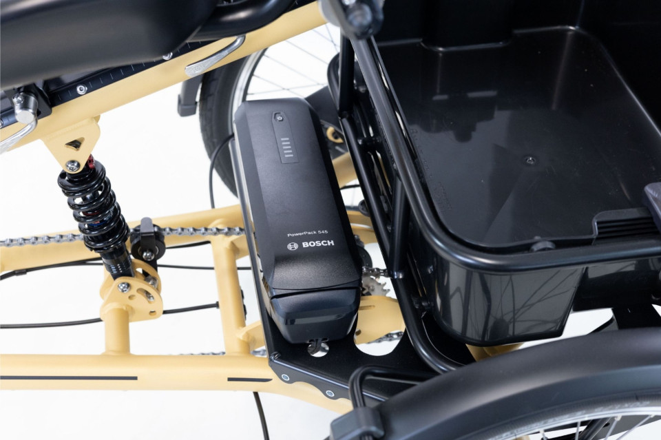 De accu van deze elektrische driewieler is boven uw boodschappenmand geplaatst. Hierdoor kunt u deze zonder te hoeven bukken, gemakkelijk uitnemen om eventueel binnen op te laden of aan de lader te zetten terwijl de accu zich nog in de fiets bevindt. Er is nameiljk een extra oplaadpoort op de fiets gemaakt op hoogte zodat het stekkeren erg gemakkelijk gaat. De accu is standaard al 545Wh sterk en dat zorgt ervoor dat u lang kunt genieten op één acculading, tot ruim 120km! Wilt u lange afstanden maken op één acculading? Dan kunt u ervoor kiezen om een grotere accucapaciteit te kiezen.