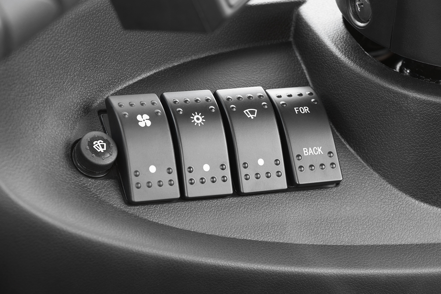 Dit bedieningspaneel van de Geco Ole V9 elektrische brommobiel is ontworpen voor gemakkelijk en intuïtief gebruik. Het paneel bevat vier duidelijke schakelaars die de belangrijkste functies van het voertuig bedienen: