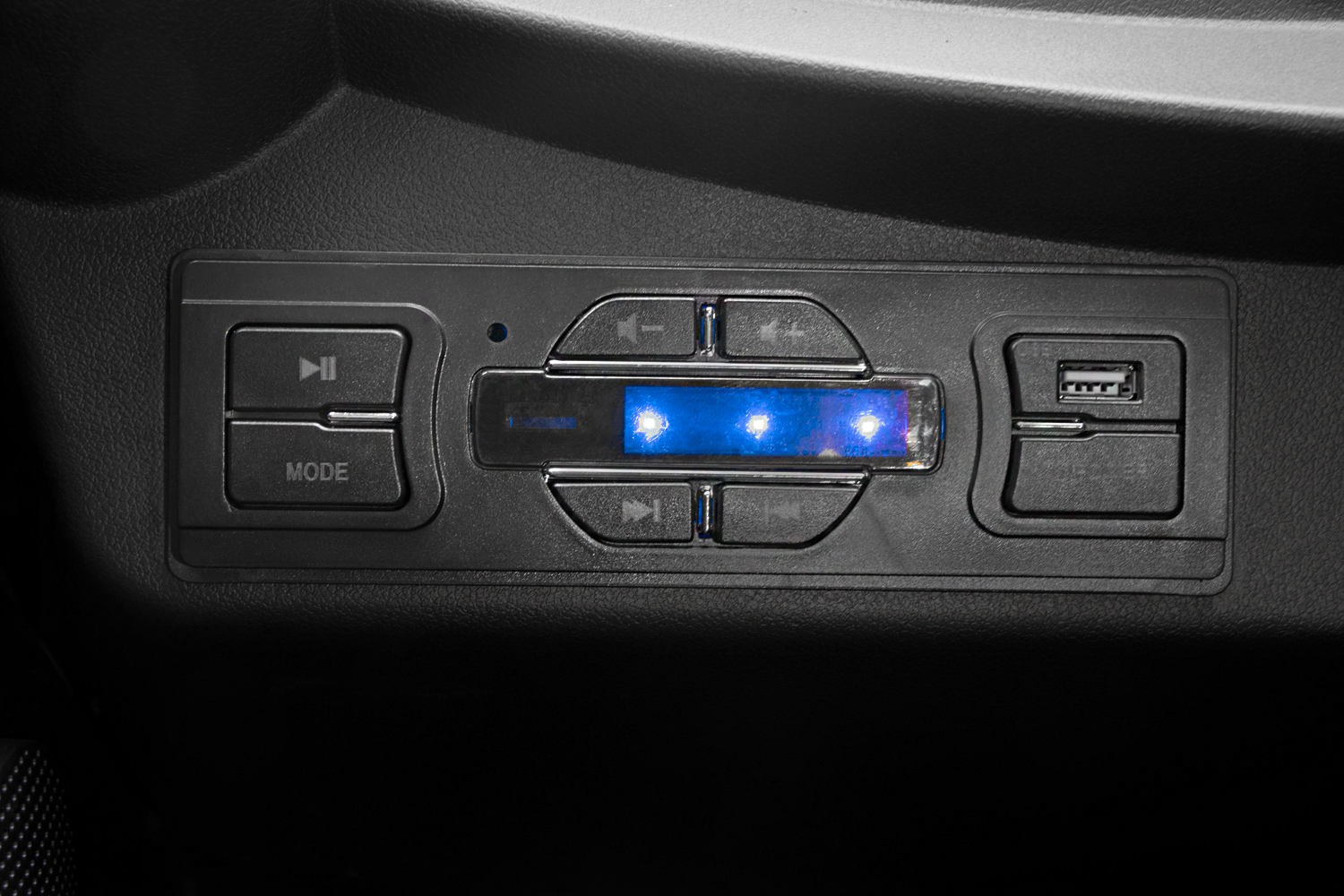 Aan beide zijden van het display zijn knoppen geplaatst voor het aanpassen van het volume en het overslaan van nummers. Daarnaast is er een USB-poort beschikbaar aan de rechterkant van het paneel, wat gebruikers de mogelijkheid biedt om externe apparaten aan te sluiten en op te laden of muziek af te spelen via een USB-stick.