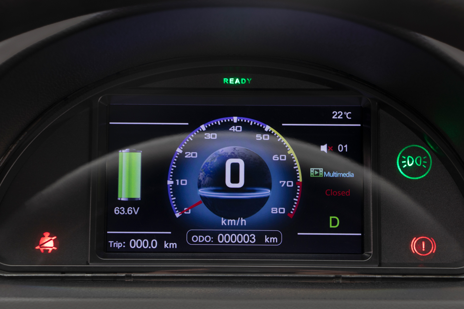 Het display bevat ook multimedia-informatie en biedt meldingen zoals of het systeem momenteel gesloten is, wat aangeeft dat het voertuig klaar is voor gebruik, aangeduid door de "READY"-melding bovenaan. Het gebruiksvriendelijke en moderne design van het display zorgt ervoor dat de bestuurder alle nodige informatie in één oogopslag kan zien.