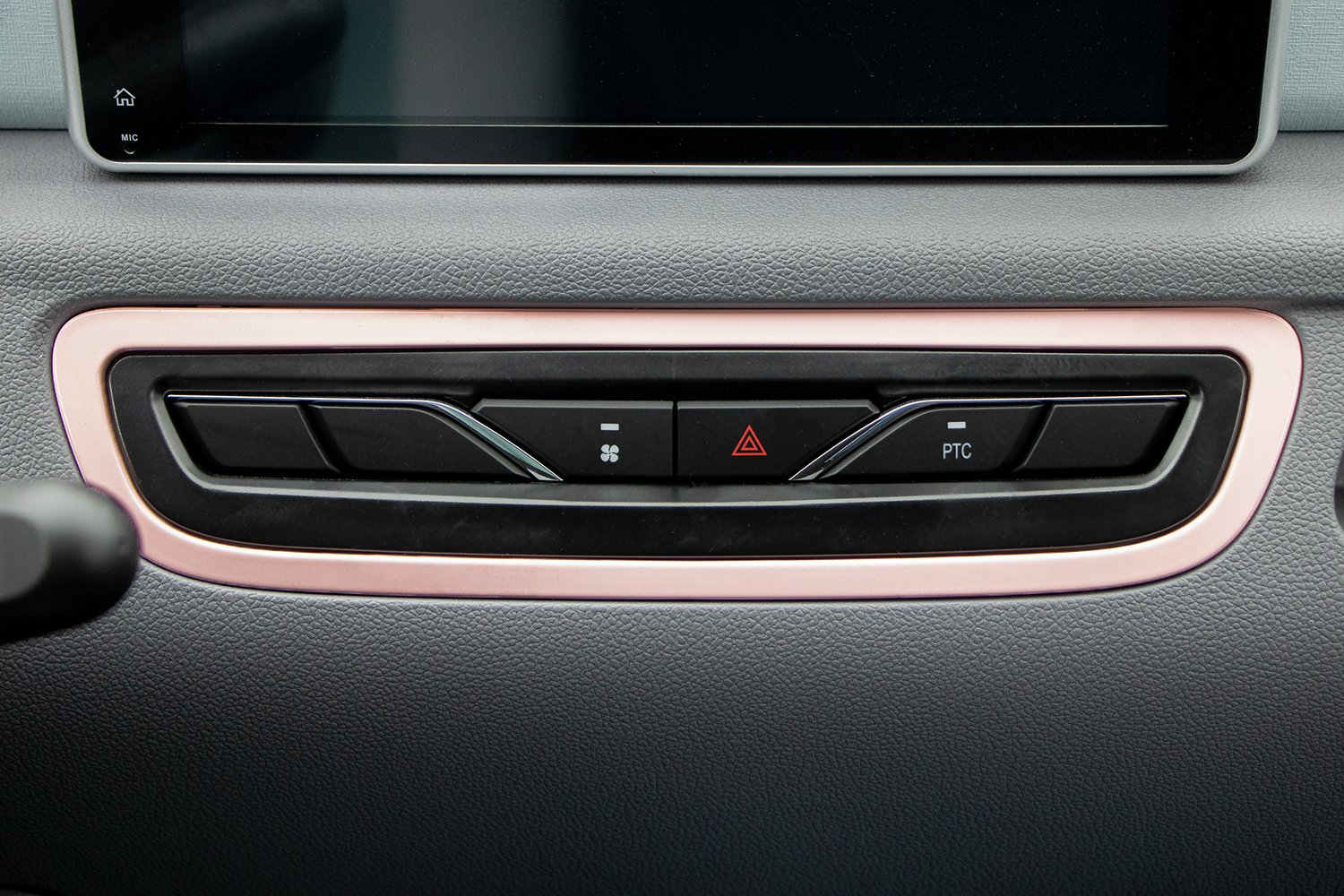 De Geco Amy is voorzien van een strak vormgegeven bedieningspaneel dat zich centraal onder het multimediascherm bevindt. De bedieningselementen zijn duidelijk gelabeld en intuïtief te gebruiken. Aan de linkerkant bevindt zich de ventilatieknop om de luchtcirculatie in het voertuig te regelen, terwijl de knop in het midden dient voor de waarschuwingslichten. Aan de rechterkant is de PTC-knop, waarmee de elektrische verwarming van het voertuig kan worden ingeschakeld.