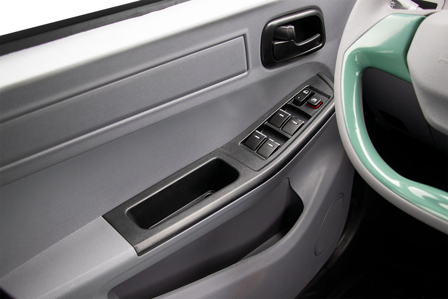 Het deurpaneel van de Geco Amy is ontworpen met oog voor functionaliteit en gebruiksgemak. Het paneel bevat verschillende bedieningselementen, waaronder elektrische raamknoppen die gemakkelijk bereikbaar zijn voor de bestuurder. Daarnaast is er een vergrendelknop voor de centrale deurvergrendeling, waardoor veiligheid en controle binnen handbereik zijn.