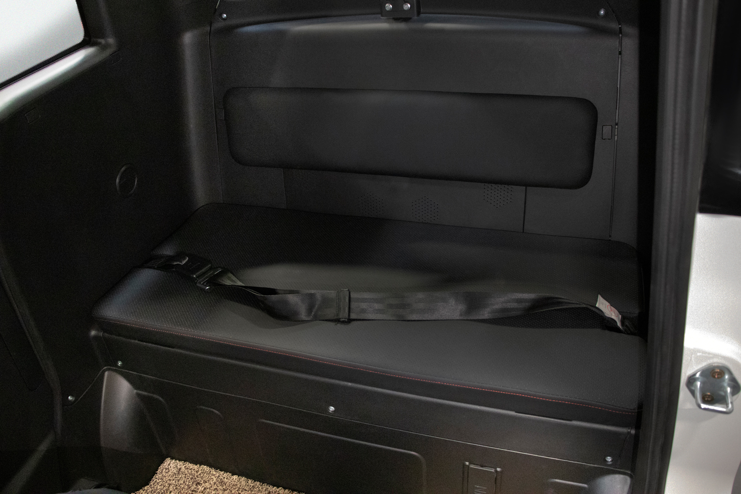 De bank is voorzien van een geïntegreerde veiligheidsriem, wat bijdraagt aan de veiligheid van de passagiers. Hoewel de ruimte beperkt is, biedt de bank voldoende zitcomfort voor korte ritten in de stad. De strakke afwerking van de achterbank en de omliggende interieurpanelen benadrukt het moderne en minimalistische ontwerp van de Geco Buena2 V2, waarbij functionaliteit en stijl perfect in balans zijn.