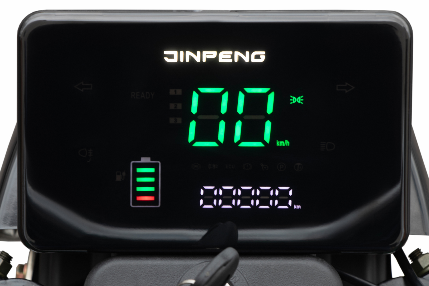 Het accuniveau wordt gepresenteerd met een visuele batterij-indicator die in vier segmenten de resterende lading toont. Verder zijn er iconen aanwezig voor richtingaanwijzers en lichtsignalen, wat het rijgemak vergroot. Dit moderne, minimalistische ontwerp biedt niet alleen functionaliteit, maar draagt ook bij aan de algehele uitstraling van het voertuig.