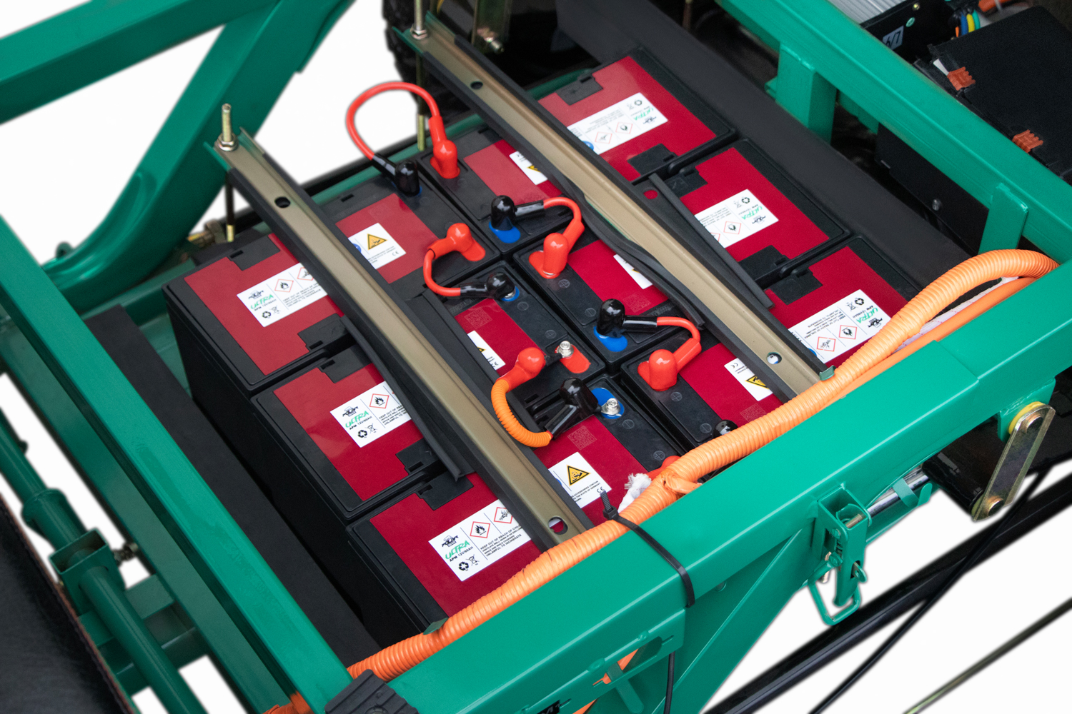 Het geavanceerde ontwerp van de accu-opslagruimte biedt gemakkelijke toegang voor onderhoud en vervanging, zonder in te boeten op veiligheid. De oranje kabels, die duidelijk zichtbaar en netjes georganiseerd zijn, vormen de verbinding tussen de accu’s en de elektromotor. Deze batterijen leveren voldoende vermogen om lange afstanden af te leggen zonder frequent opladen en bieden een milieuvriendelijk alternatief voor brandstofmotoren.