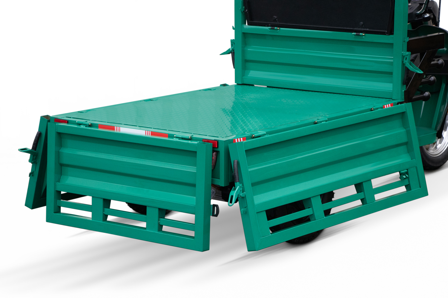 Het laadoppervlak zelf is vlak en breed genoeg om een verscheidenheid aan ladingen te dragen, van bouwmaterialen tot boodschappen, waardoor het voertuig geschikt is voor zowel commercieel gebruik als persoonlijke taken. De laadkleppen zijn voorzien van een stevige sluiting om de veiligheid van de lading te garanderen tijdens het transport. Dankzij de robuuste constructie kan de laadruimte ook zwaardere ladingen aan zonder dat dit ten koste gaat van de stabiliteit van het voertuig, waardoor het een uitstekende keuze is voor licht werk in stedelijke omgevingen of op het platteland.