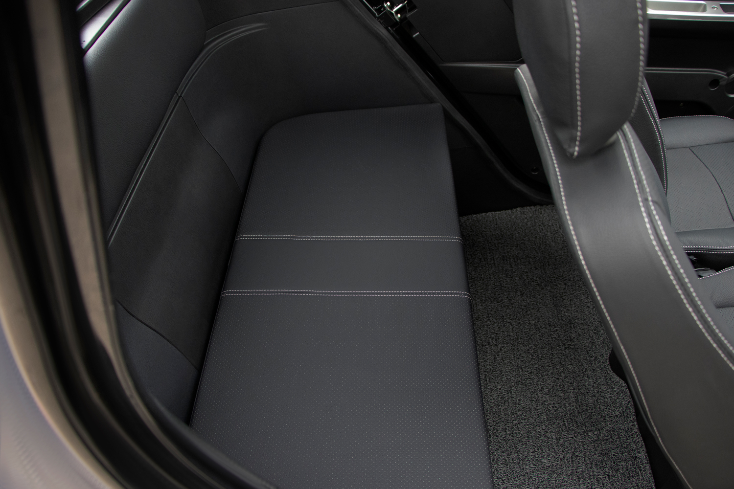 De achterbank is eenvoudig maar functioneel, met voldoende ruimte voor passagiers of opslag. Het interieur is afgewerkt met strakke lijnen en een moderne uitstraling, waarbij de deurpanelen zilverkleurige accenten hebben die goed aansluiten bij het dashboardontwerp.