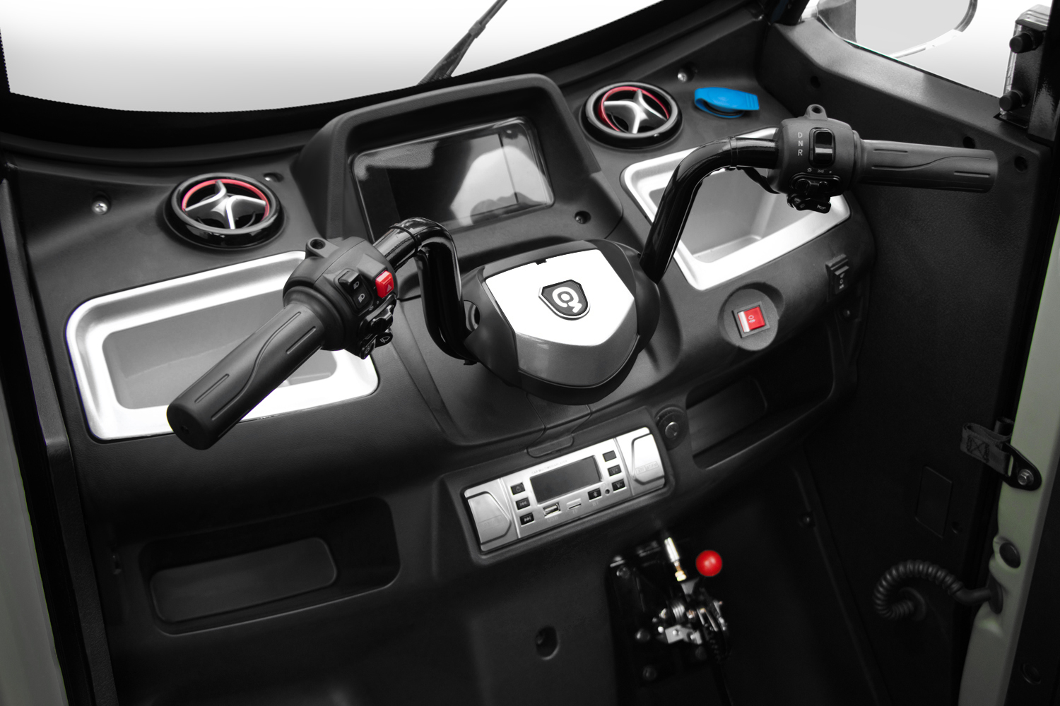 De Geco Heavy Truck gXP bied een overzichtelijke, robuuste opstelling voor de bestuurder. Aan beide zijden van het stuur bevinden zich gashendels voor een intuïtieve bediening. De rechterzijde heeft extra functies, waaronder bediening voor de versnellingen (Drive, Neutral, Reverse) en enkele knoppen voor de verlichting en claxon, die strategisch zijn geplaatst voor eenvoudige toegang. Het dashboard zelf heeft handige opbergruimtes en twee ventilatieroosters, voor een betere luchtcirculatie tijdens het rijden.